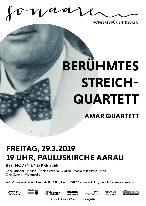 Seit Paul Hindemiths 100. Geburtstag 1995 hat das Ensemble die Ehre, den Namen AMAR QUARTETT zu tragen. Hindemith gründete 1922 als Bratschist unter diesem Namen ein Quartett, benannt nach dessen erstem Geiger Licco Amar. Das AMAR QUARTETT hat sich mit aussergewöhnlichen Eigenveranstaltungen wie dem Kammermusikfestival «Hommage an Hindemith» oder mit der Reihe «TONWORT» einen Namen gemacht. Im Sommer 2018 hat es sein Wissen in Slowenien am internationalen Meisterkurs Ars Haliaeti weitergegeben und ist 2018 für eine Tournee erstmals nach China gereist. In Aarau geniesst das Publikum Beethovens Streichquartett op. 18 Nr. 2 in G-Dur sowie das einzige Streichquartett von Fritz Kreisler in a-Moll.