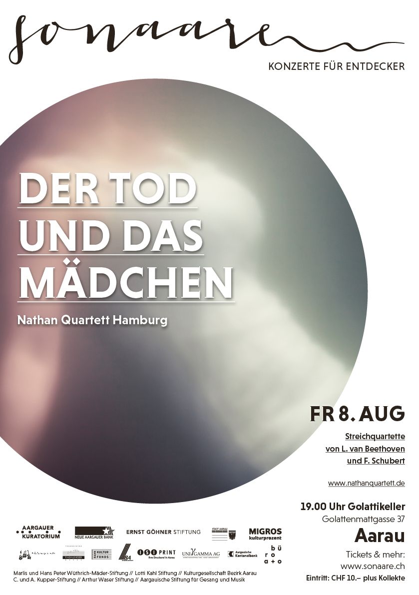 Das nathan quartett hamburg hat seit den Anfängen eine besondere Verbindung zur Schweiz. Seit über acht Jahren bestreitet das Quartett in Basel eine eigene Konzertreihe. Die Konzerte zeichnen sich aus durch Aufführungsoriginalität und berührende Interpretationen. Erstmals ist das Streichquartett nun in Aarau zu hören. Mit Beethovens Streichquartett erklingt ein noch ganz der klassischen Tradition verpflichtetes Jugendwerk, welches schon den grossen Meister ahnen lässt. Dazu ertönt Schuberts reifstes Streichquartett «Der Tod und das Mädchen». Dieses Werk ist in der Gegensätzlichkeit seiner Aussage unübertroffen: Ungestüme Wildheit trifft auf zarteste Melodien, Ausgelassenheit und Freude auf Innigkeit und Schmerz.