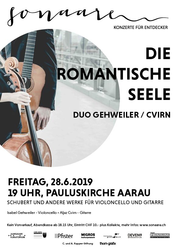 Der Gitarrist Aljaz Cvirn und die Cellistin Isabel Gehweiler beleben im Duo das Repertoire für Violoncello und Gitarre. Beide Musiker sind Preisträger zahlreicher Wettbewerbe, wie als Duo bei dem Paula Ruminelli Wettbewerb 2017. Die aparte Kombination beider Instrumente kreiert eine zauberhafte kammermusikalische Intimität. Obwohl originale Kompositionen rar sind, konnten sich Bearbeitungen, wie die Arpeggione Sonate von Franz Schubert in der Version für Violoncello und Gitarre etablieren.