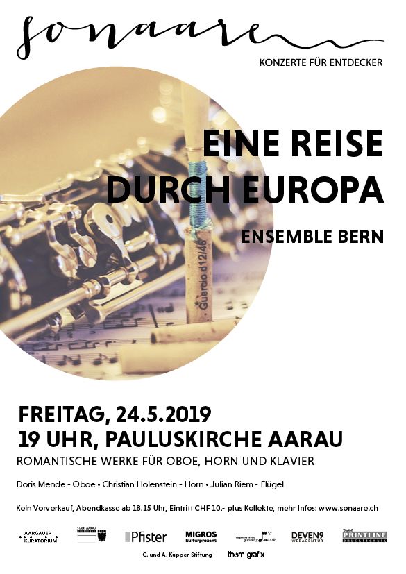 Marc Lachat, Christian Holenstein und Julian Riem verbindet seit ihrem ersten gemeinsamen Konzert vor vielen Jahren leidenschaftliches Musizieren und ungebremste Spielfreude. Die internationalen Solisten und Kammermusiker des Ensemble Bern präsentieren an diesem Sonaare-Konzert die romantischen Meisterwerke für Oboe, Horn und Klavier und nehmen das Publikum mit auf eine Reise durch Europa. Es dürfen selten gehörte, wunderschön romantische Trios von Carl Reinecke, Robert Kahn und Heinrich von Herzogenberg genossen werden.