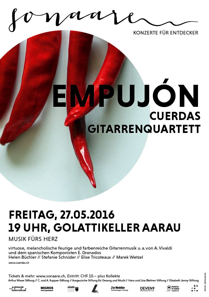 An diesem lauen Frühlingsabend wehte ein neuer Klang durch den Golattikeller, wie er anlässlich der Sonaare-Konzerte und auch sonst wo eher selten zu hören ist. Es war der farbenfrohe, variantenreiche und sehr fein und stimmig erzeugte Klang des klassischen Gitarrenquartetts Cuerdas (Helen Büchler, Stefanie Schnider, Elise Tricoteaux und Marek Wetzel). Mit ihrem kommentierten Konzert und den teilweise eigens arrangierten Werken aus verschiedenen Epochen, Ländern und Stilen boten sie dem zahlreich erschienenen Publikum ein besonderes Hörerlebnis und brachten manch einem die klassische Gitarre einiges näher. (sl)