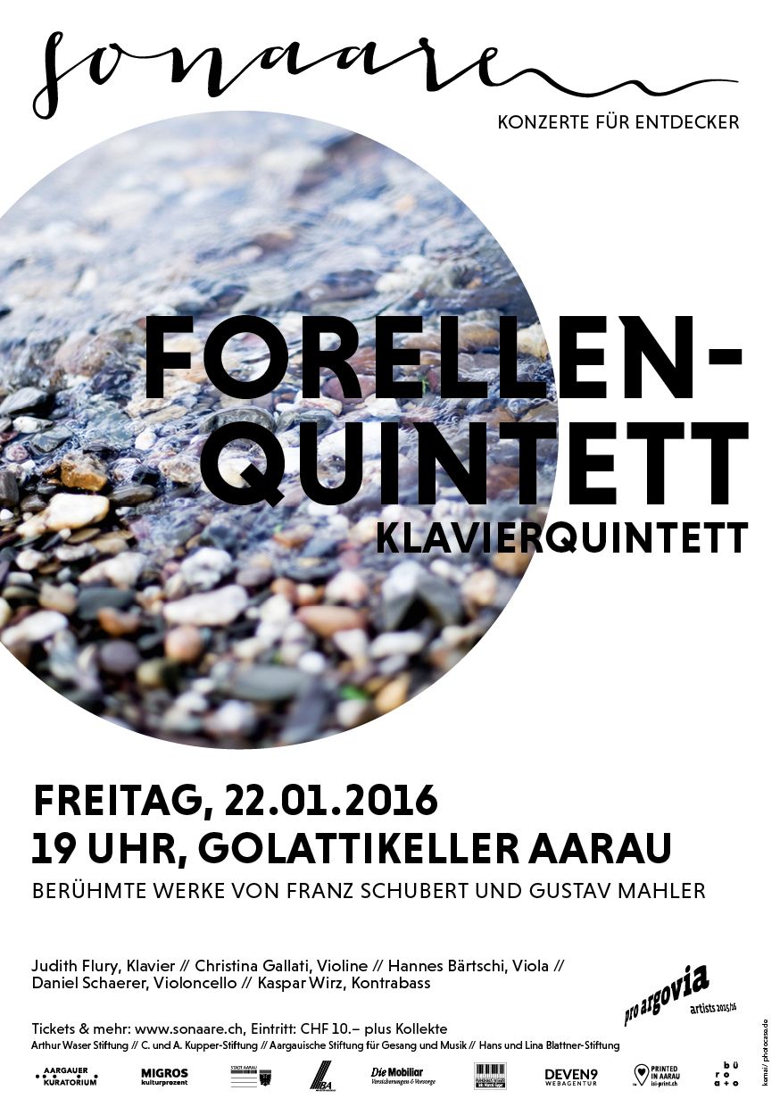Ein hochkarätiges Ensemble mit bekannten Sonaare-Gesichtern formiert sich exklusiv für dieses Konzert. Franz Schuberts Forellenquintett ist wohl eines seiner berühmtesten Werke und besticht durch seine fröhliche, musikantische Grundhaltung sowie eine meisterhafte Variationskunst im vierten Satz, welcher dem Opus seinen Beinamen gegeben hat. Als musikalische Ouvertüre erklingt der Klavierquartett-Satz von Gustav Mahler, ein unvollendet gebliebenes Werk aus seiner Jugend, das aber bereits den Klangsinn und die Farbigkeit seiner Meisterwerke erahnen und seine Wurzeln bei Schubert, Schumann und Brahms erkennen lässt.