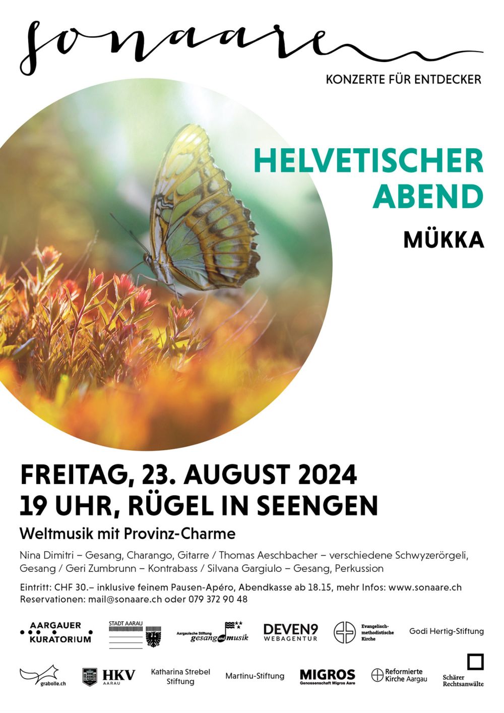 Nina Dimitri, die in der ganzen Welt Konzerte gibt, verzaubert das Publikum mit ihrem Quartett «Mükka» mit südamerikanischem und Schweizerischem Volksliedgut. Das Spiel der Gitarre und des «Charango» hat Nine Dimitri in Bolivien perfektioniert. Dank ihrer einmaligen Stimme und ihrer tiefen Ausdruckskraft werden ihre Konzerte zu unvergesslichen Erlebnissen. Thomas Aeschbacher gehört zu den besten Schwyzerörgeli-Spielern und ist seit 2023 Träger des goldenen Violinschlüssels. Dieser gilt als höchste Auszeichnung in der Welt der Schweizer Volksmusik.
