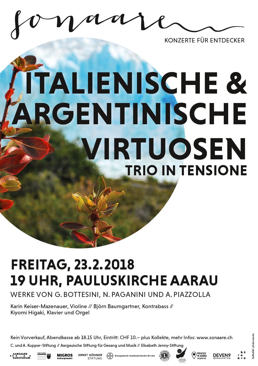Leider hat sich der Kontrabassist Björn Baumgartner am Daumen verletzt und kann nicht wie vorgesehen spielen. Mit Viorel Alexandru, dem ersten Solobassisten der Oper Zürich, konnte aber eine internationale Grösse als Ersatz gefunden werden und so wird er in Aarau als Kontrabassvirtuose zu hören sein. Mit dabei sind wie vorgesehen Karin Keiser-Mazenauer an der Violine und Kiyomi Higaki am Klavier und der Orgel. Die Musik des Trios bewegt sich im Spannungsfeld von zarten, melancholischen Melodien und hochintensiv impulsiven Ausbrüchen sowie zwischen höchsten Höhen und tiefsten Tiefen und verlangt den Musikern einiges an Virtuosität aber auch gefühlvollen Klängen ab. In Aarau sind virtuose und ergreifende Solo, Duo und Trio-Werke von J.S. Bach, G. Bottesini, N. Paganini, M. de Falla, E. Granados und A. Piazzolla zu hören.
