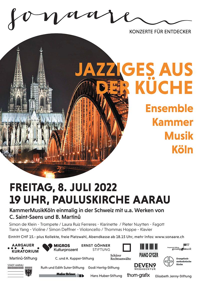 Freuen Sie sich auf das Ensemble der KammerMusikKöln, das Sie mit musikalischen Delikatessen, wie den jazzigen Klängen aus der Küche eines Bohuslav Martinů sowie weiteren Kostbarkeiten von u.a. Oskar Böhme und Camille Saint-Saëns in Besetzungen vom Duo bis zum Sextett verwöhnen wird Tauchen Sie ein in den Kosmos exquisiter Kammermusik mit KammerMusikKöln, die in den Musikstädten Köln und Bonn eine Institution ist und deren Markenzeichen die seit nunmehr zehn Jahren gewachsene außergewöhnliche Kammermusik auf höchstem musikalischem Niveau ist. Sie präsentiert sich hier mit führenden Musikern der renommiertesten Orchester Kölns und Rotterdams sowie Solisten von internationalem Ruf.
