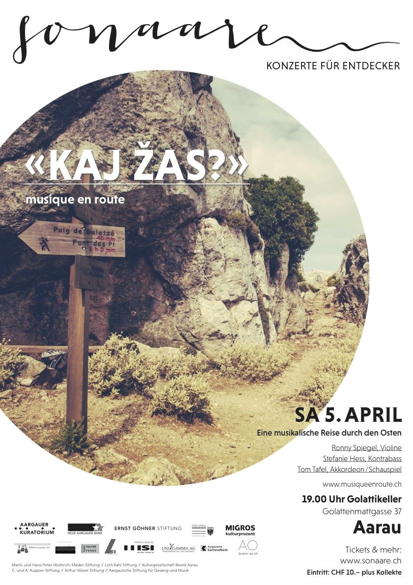 Kaj žas? – Wohin gehst du? Nach Aarau in den Golattikeller, könnte man meinen, wenn man die Menschenschlange vor der Abendkasse sah. Schliesslich war dann der Golattikeller rekordverdächtig voll, das Konzert total ausverkauft und eine weitere tolle musikalische Entdeckungsreise konnte beginnen. Musique en route – das sind Ronny Spiegel (Violine), Stefanie Hess (Kontrabass), Tom Tafel (Akkordeon) und zur Überraschung in der zweiten Hälfte Ariel Rossi (Gitarre) – spielten virtuose, melancholische östliche Klänge, verzückten das gut gelaunte Publikum mit rassigen Roma- und Balkanmelodien und gaben auch gleich noch etwas Rhythmus-Unterricht (wie ging das noch gleich mit Winterthur-Züri-Aarau?). Es war eine sehr beschwingte, flüssig und mitreissend dargebotene Reise über Stock und Stein, vorbei an Räuberhöhlen, traditionellen Weinlokalen, Brünetten und Blondinen… Das Publikum war begeistert!
