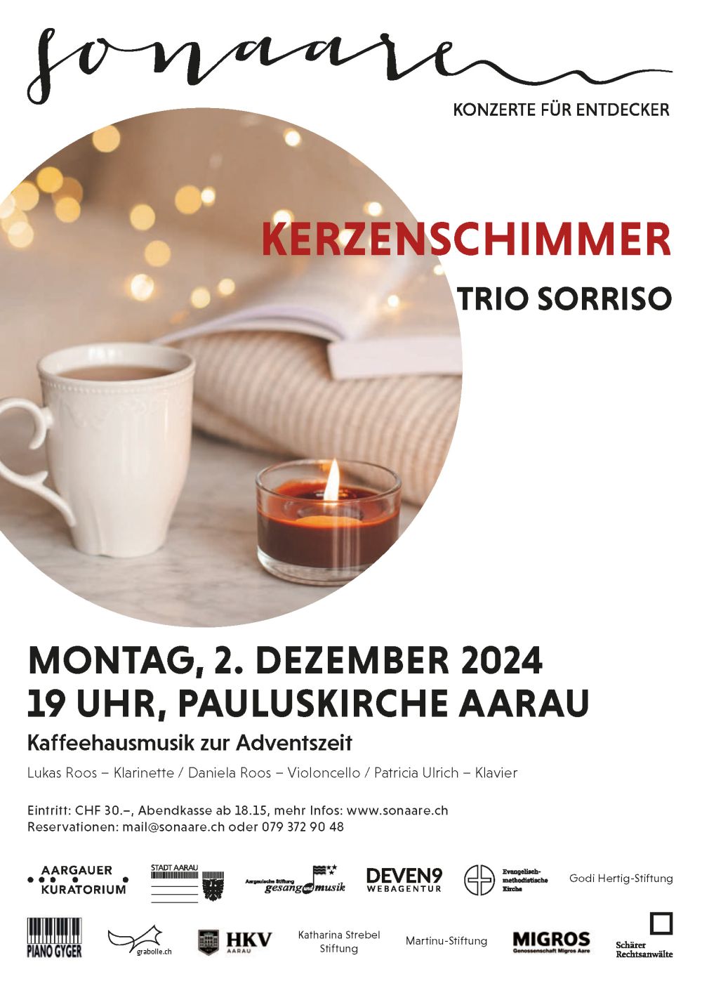 «Kerzenschimmer» mit dem Trio Sorriso; gespielt wird süffige Kaffeehausmusik passend zur Adventszeit, die das Herz berührt. Es erklingen wunderbare bekannte Melodien, Musikperlen und Salonstücke aus verschiedenen Genres und Epochen. Das Adventsprogramm reicht vom «Blumenwalzer» und «Grossmütterchen» bis zu «drei Haselnüsse für Aschenbrödel» und «Winterwonderland». Damit die Musik ganz verinnerlicht werden kann, findet das Konzert bei Kerzenschein statt. Untermalt werden die Ohrwürmer mit amüsanten Anekdoten aus der Welt der Kaffeehausmusik.