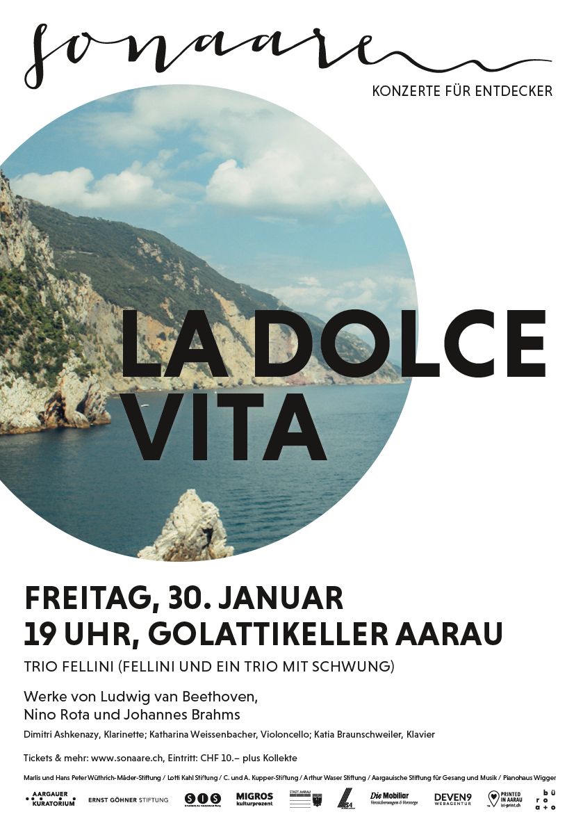 Schneegestöber, grauer Wolkendeckel, dicke Mäntel, kalte Luft, aber auch ein paar Sonnenstrahlen – so präsentierte sich die Stimmung in Aarau, bevor das Trio Fellini zur Eröffnung der Sonaare-Saison 2015 in den Golattikeller fand. Dimitri Ashkenazy (Klarinette), Katharina Weissenbacher (Violoncello) und Katia Braunschweiler (Klavier) verstanden es, den wiederum restlos ausverkauften Saal durch ihr intensives und berührendes Spiel mit viel Wärme zu füllen. Sie begeisterten mit einem ausgewogenen und wunderbar stimmig interpretierten Programm mit Musik von Ludwig van Beethoven (op. 11, B-Dur, «Gassenhauer Trio»), Nino Rota und Johannes Brahms (op.114 in a-Moll, «Klarinetten Trio»), so dass man vor dem geistigen Auge doch tatsächlich Marcello Mastroianni und Anita Ekberg mit einem warmen Lächeln ins süsse Leben entschwinden wähnte. Aarau kann also auch einmal Rom sein – oder zur Zugabe gar Buenos Aires. Oder Sommer im Winter. Oder eben La Dolce Vita.