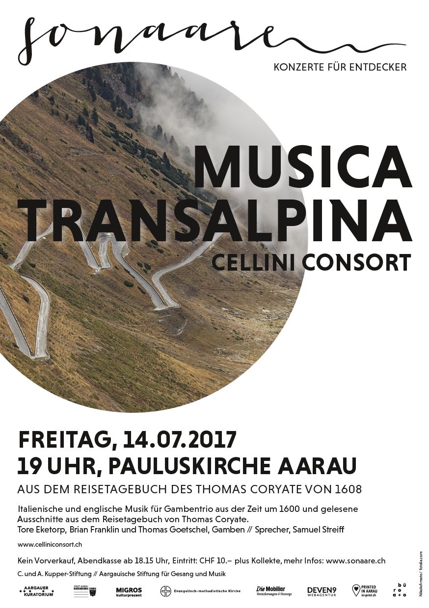 Zu Fuss, Pferd, Kutsche und per Schiff reiste der Engländer Thomas Coryate 1608 durch Europa: Von London via Frankreich nach Venedig, dann über die Schweiz, Deutschland und Holland wieder zurück nach London. Was er auf dieser Reise alles sah, hörte und erlebte, hielt er in einem Reisetagebuch fest, das zu seiner Zeit sehr populär war. Ebenfalls sehr populär war in London zur gleichen Zeit die neue italienische Musik: Unter dem Titel «Musica Transalpina» erschien 1588 eine Sammlung italienischer Madrigale, die für viele Komponisten im England von Königin Elisabeth I. zur Inspirationsquelle wurden. Im Programm werden Ausschnitte aus dem Reisetagebuch von Thomas Coryate mit italienischen und englischen Kompositionen aus der Zeit um 1600 kombiniert. Die drei Musiker zeichnen sich aus durch ihre grosse Leidenschaft für die Gambenmusik von Renaissance und Barock, durch ihre intensive Auseinandersetzung mit den Werken und ihrer Ausführung, sowie durch ihre langjährige Erfahrung im Bereich der historischen Aufführungspraxis. Dies lässt ihnen im Moment des gemeinsamen Konzertierens viel Raum für Spontaneität, wodurch die Musik wieder in ihrer ursprünglichen Frische erklingen kann.