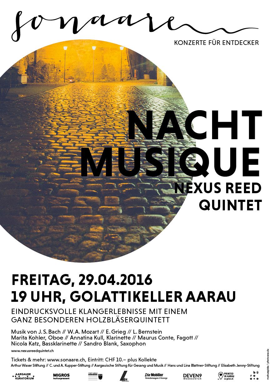 «An diesem kühlen aber sonnigen Aprilabend entschieden sich wiederum über 100 Musikliebhaber, nach Aarau in den Golattikeller zu pilgern. Und dies nicht ohne Grund. Das junge, international ausgezeichnete Holzbläserquintett NEXUS reed quintet war auf Besuch und verzückte mit Präzision, Virtuosität und Vielfalt. Die selten gehörte, bestens harmonierende und eingespielte Besetzung mit Oboe (Marita Kohler), Klarinette (Annatina Kull), Saxofon (Sandro Blank), Bassklarinette (Nicola Katz) und Fagott (Maurus Conte) zog alle in ihren Bann und liess immer wieder ein Raunen durch das Gewölbe gehen. So begeisterten die jungen Musiker das jung gebliebene Publikum mit Stücken von J.S. Bach und W.A. Mozart über E. Grieg bis zu den bekannt jazzigen, eigens arrangierten Klängen von L. Bernstein. Wahrlich eine Nacht der Musique! (sl)»