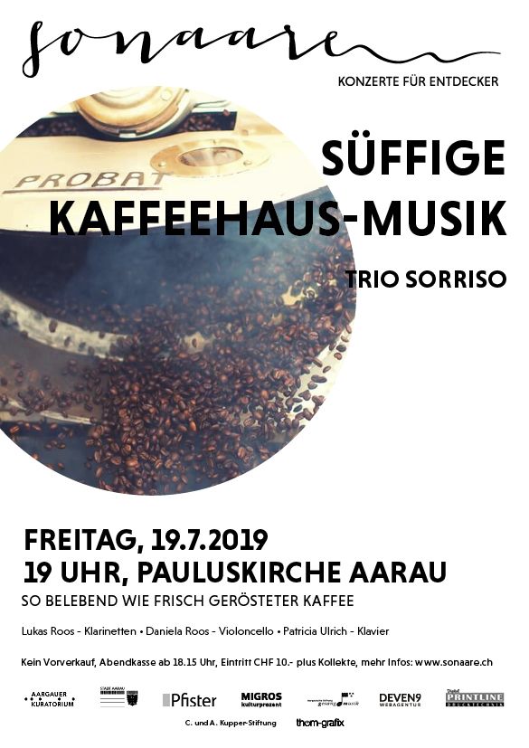 Das Trio Sorriso flösst der Kaffeehausmusik neues Leben ein. Beschwingt, unterhaltsam, mit Charme und Witz sorgt das Trio für beste Laune in entspannter Atmosphäre. Möglich macht’s der wunderbare Mix aus bekannten Melodien, Musikperlen und Salonstücken aus verschiedenen Genres und Epochen. Das luftig-leichte Repertoire reicht von «Besame mucho» und «Salut d‘ amour» bis zu «I love coffee, I love tea» oder «Zuckerfee». Untermalt werden die Ohrwürmer mit amüsanten Anekdoten aus der Welt des Kaffees. Was bei diesem geballten musikalischen Können herauskommt, ist alles andere als kalter Kaffee.