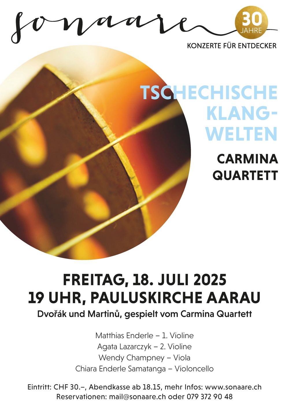 Das 1929 komponierte 3. Streichquartett von Bohuslav Martinů ist kurz und prägnant. Trotzdem gelingt es dem Komponisten, vielfältigste Klangfarben und Einflüsse bis hin zum Jazz einzubeziehen. Das warmherzige «Amerikanische» Quartett von Antonín Dvořák, weniger als 40 Jahre zuvor komponiert, teilt die Inspiration aus der osteuropäischen Volksmusik und kombiniert diese mit musikalischen Eindrücken aus Dvořáks Aufenthalt in den USA, wo das Werk komponiert wurde. Das Carmina Quartett, 1984 in der Schweiz gegründet, blickt auf eine lebendige und preisgekrönte Karriere zurück und spielt heute in einer Besetzung, welche die langjährige Erfahrung der Gründungsmitglieder mit dem Elan der Jugend in Verbindung bringt.