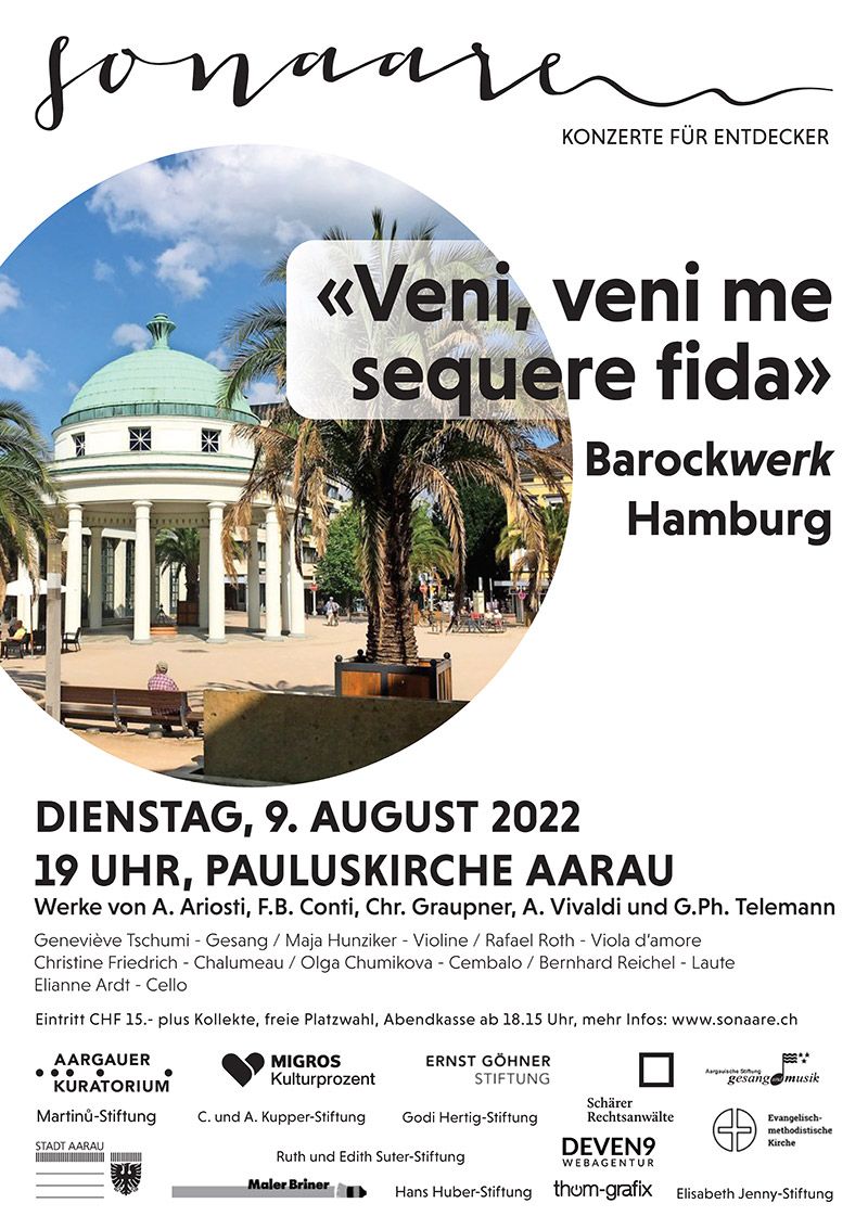 Geneviève Tschumi – Gesang / Maja Hunziker – Barockvioline / Rafael Roth – Viola d’amore / Christine Friedrich – Chalumeau / Olga Chumikova – Cembalo / Bernhard Reichel – Laute / Elianne Ardt – Barockcello