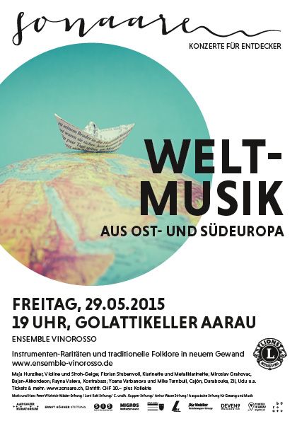 Das internationale Weltmusikensemble Vinorosso gastiert zum zweiten Mal in Aarau und wird mit traditioneller Folklore in neuem Gewand wieder ein spannendes, virtuoses und farbenreiches Programm in Sextett-Formation darbieten. Das Ensemble versteht es ausgezeichnet, Weltmusik unterschiedlicher Kulturen und Regionen ganz Ost- und Südeuropas harmonisch zusammenklingen zu lassen – voller Leben, voller Hingabe, voller Leidenschaft. www.ensemble-vinorosso.de