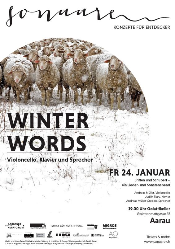 Gelungener Auftakt zu den sonaare-Konzerten 2014 mit dem Programm «Winterwords». Der Andrang war gross; bereits eine Viertelstunde vor Konzertbeginn war der Golattikeller nahezu bis auf den letzten Platz besetzt. Britten und Schubert – ein Lieder- und Sonatenabend für Violoncello, Klavier und Sprecher. Das zahlreiche Publikum war über das stimmungsvolle Konzert sehr begeistert.